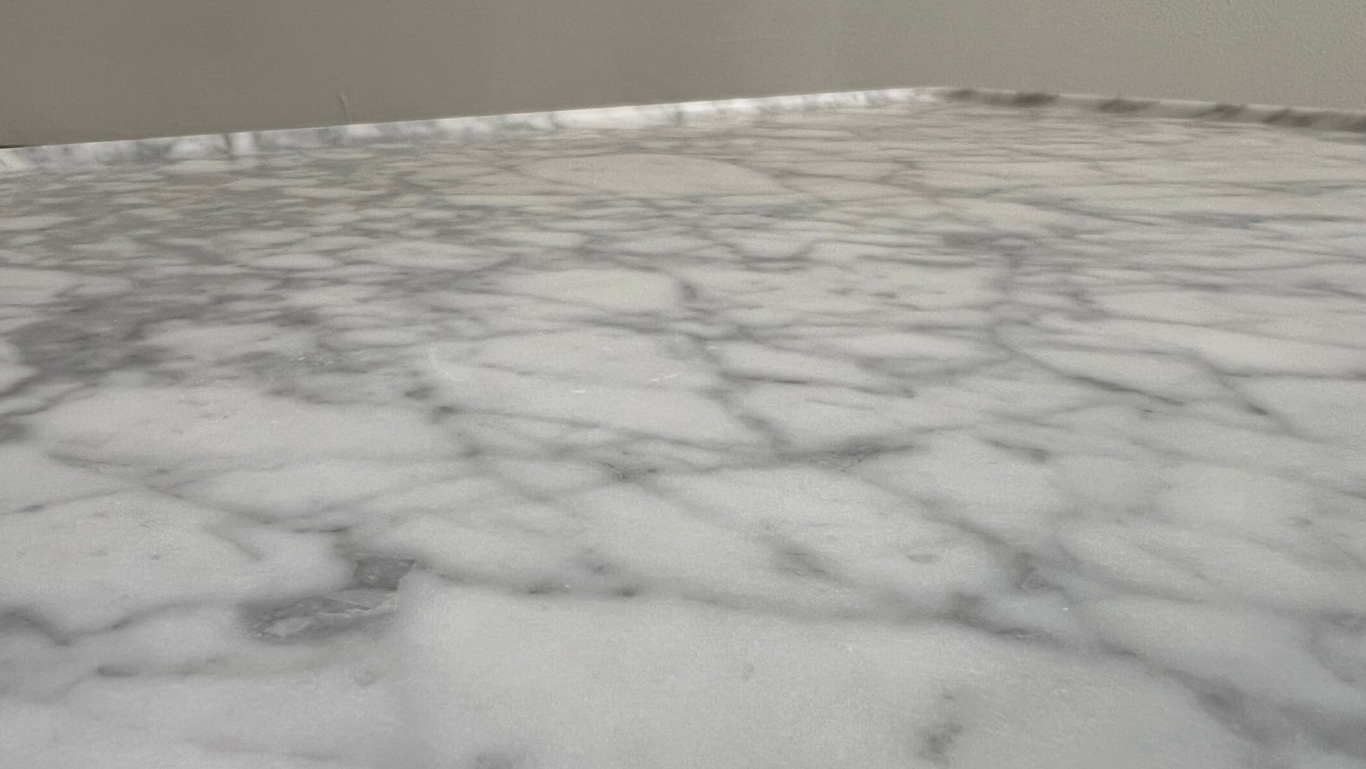 This low coffee table could also be used as a side table. At 24" square, its petite but efficient with its surface area. The edge has a small lip to gather objects. The steel base cleverly connects to the bottom of the marble to hold everything in place. The table presents very well with minimal wear to the base and no noticeable wear to the surface.