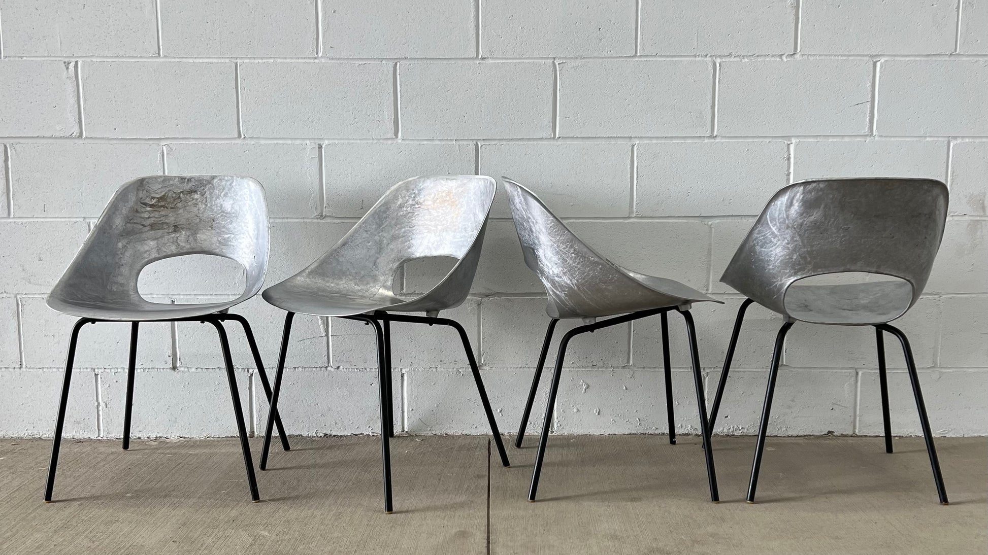 A standard of French design, the Tulipe chair by Pierre Guariche has been a rising star and is approaching the desirability of his contemporaries' designs. These chairs are in raw cast aluminum. All hardware, feet, and bases are original. Photos of original upholstery from Steiner can be shared upon request.