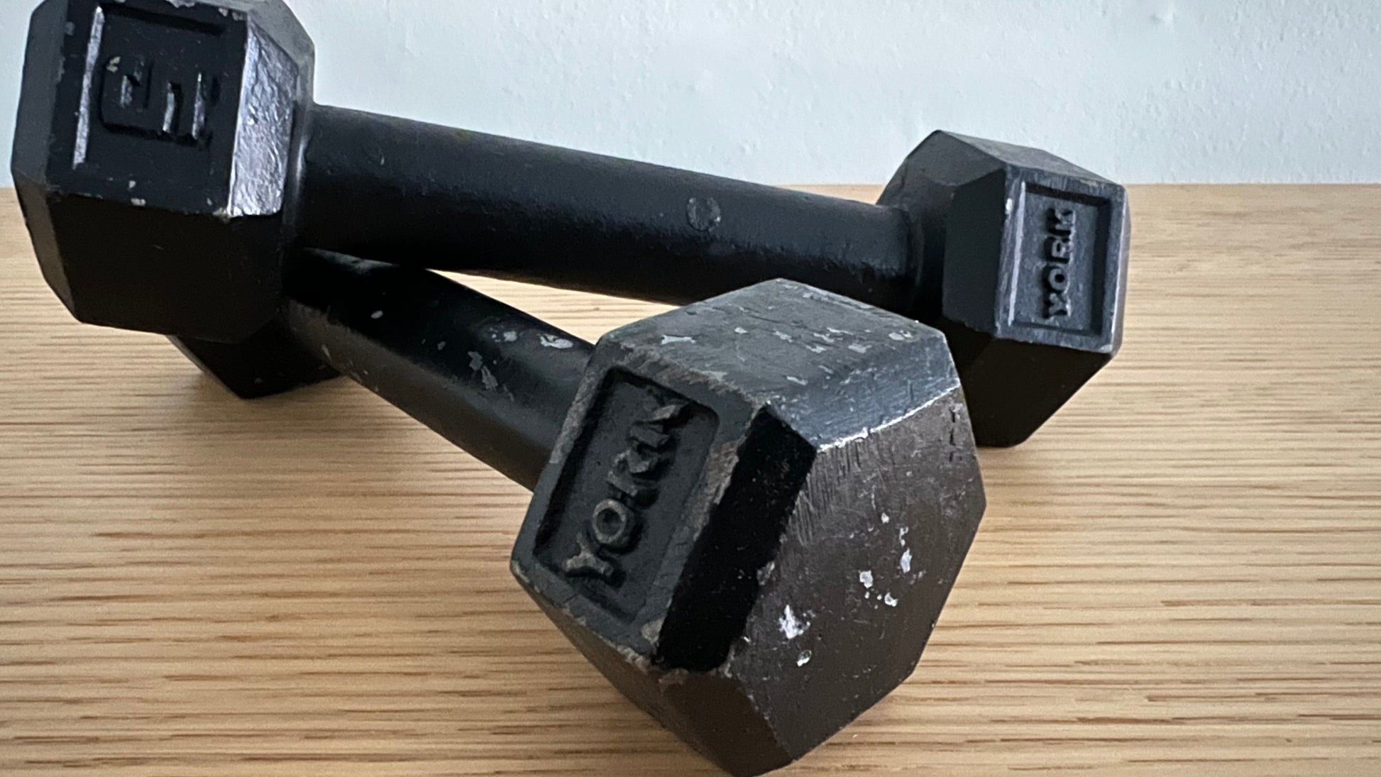 Vintage set of 5lb dumbbells by York. Iron with enamel painted coating.